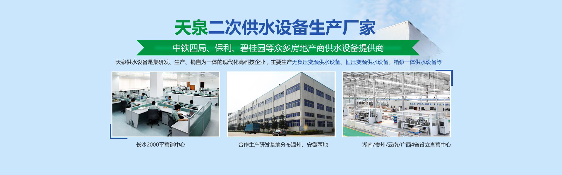長沙天泉供水設備有限公司位于長沙雨花經(jīng)濟開發(fā)區(qū)。公司是集研發(fā)、生產(chǎn)、銷售為一體的現(xiàn)代化科技型企業(yè)公司生產(chǎn)銷售的產(chǎn)品有無負壓變頻供水設備、自來水加壓泵站、變頻調速恒壓供水設備、智慧標準泵房、智慧水務、一體化預制泵站、循環(huán)水系統(tǒng)工程等二十幾大類別。